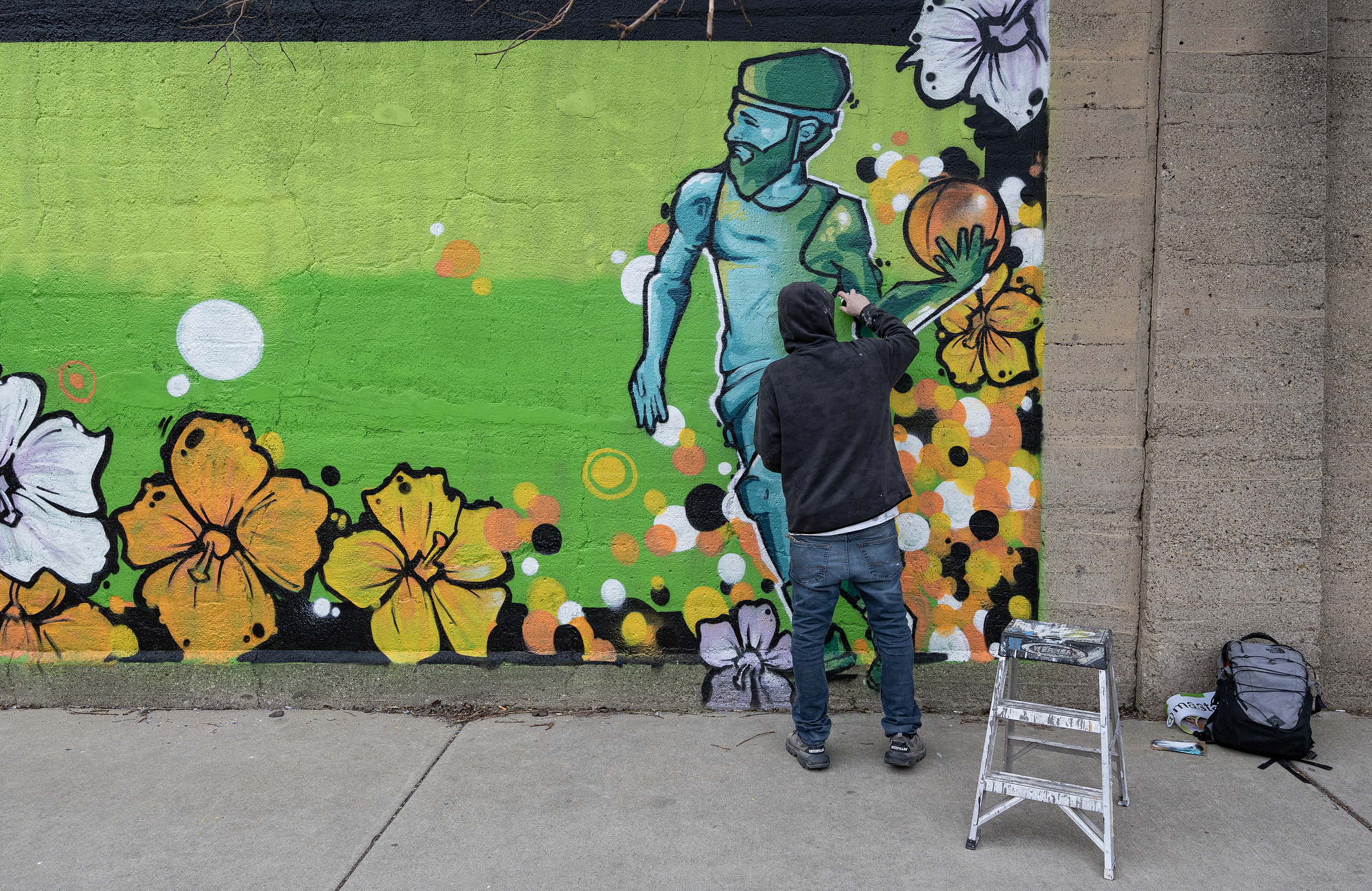 Artist Tusk One adds final touches to his mural Tuesday, Feb. 13, 2024, in downtown Indianapolis. Local artists have painted murals along the Pennsylvania and Delaware Street railroad underpasses, part of a public art collaboration between multiple organizations ahead of NBA All-Star weekend. Credit: Jenna Watson/Mirror Indy